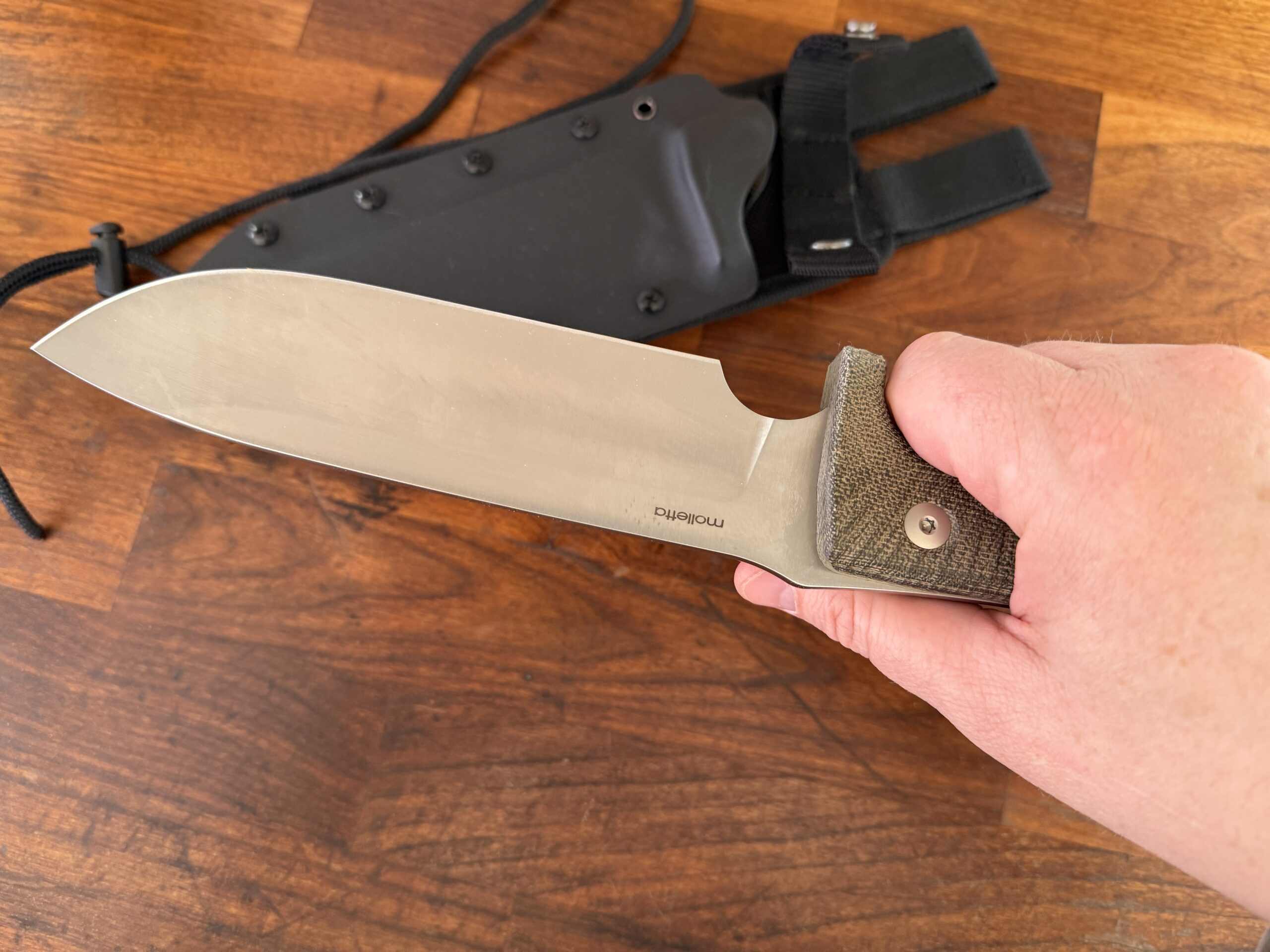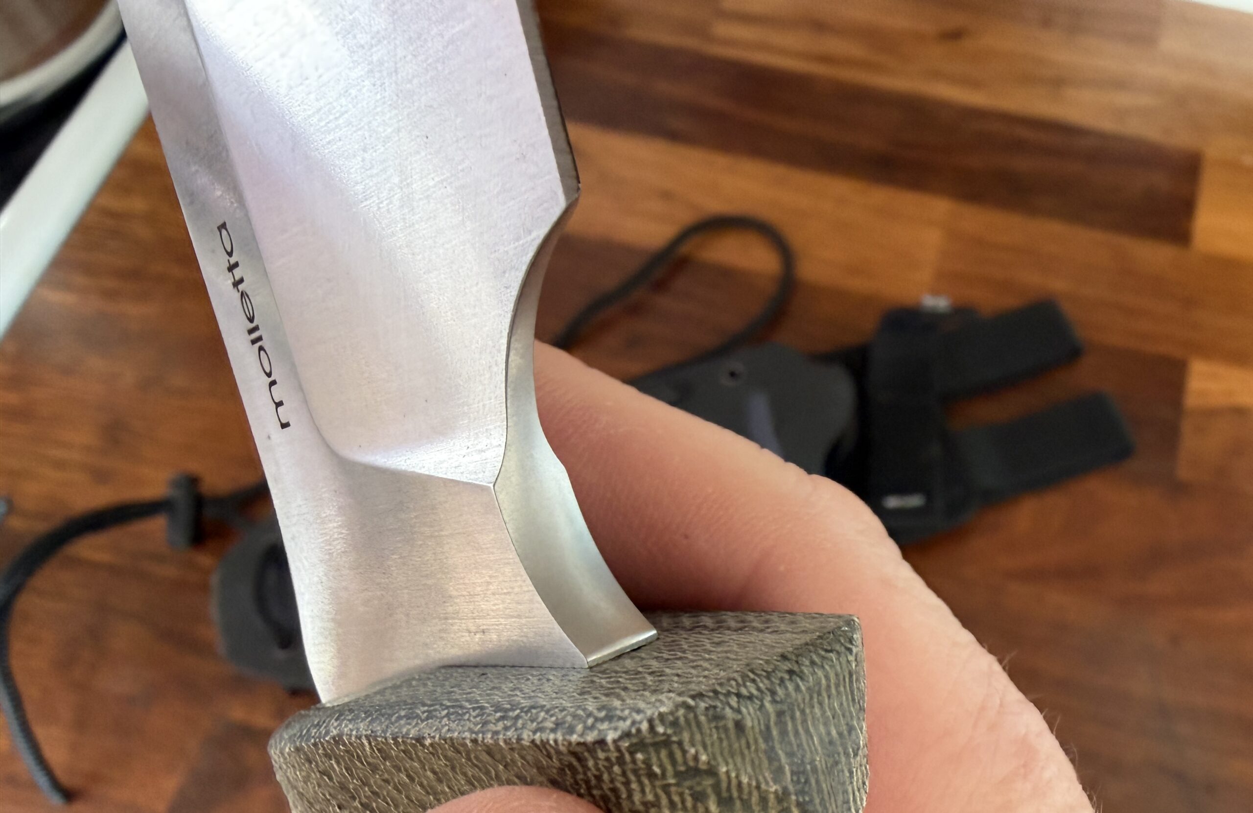 Molletta designar inte bara “utsidan”. Han har en djup förståelse för egg-geometri och metallurgi. Resultatet är en kniv som är kapabel att prestera i skogen, men som ändå har en geometri som gör att den skär förvånansvärt bra i köket, som ett gigantiskt rakblad. Många designers missar denna aspekt och gör knivarna tjocka bakom eggen för att de ska vara “tåliga”, men Molletta verkar alltid lyckas balansera hållbarhet med skärförmåga på ett nästan magiskt sätt.