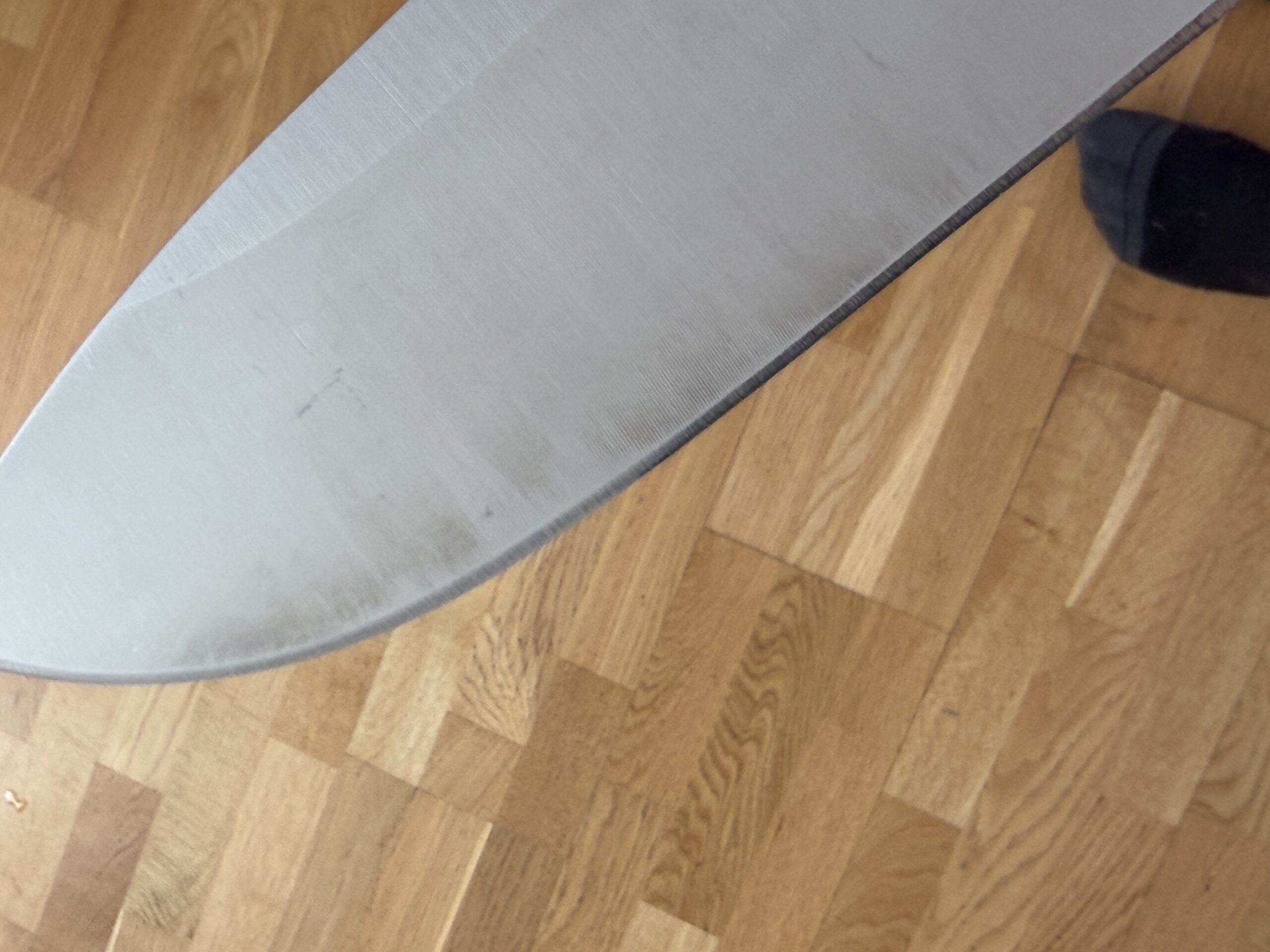 Jag har förstås diskat kniven mer än en gång, men min teori är att metallrester fortfarande kan ligga i mikroporerna i stålet och avge smak. Jag ska prova använda en kraftigare diskborste, eller stålull, och skrubba bladet ordentligt, så att jag får se om det hjälper. Om inte så finns det ett naturligt sätt att få bort smaken av stålet, nämligen att använda kniven mer. 🤭
