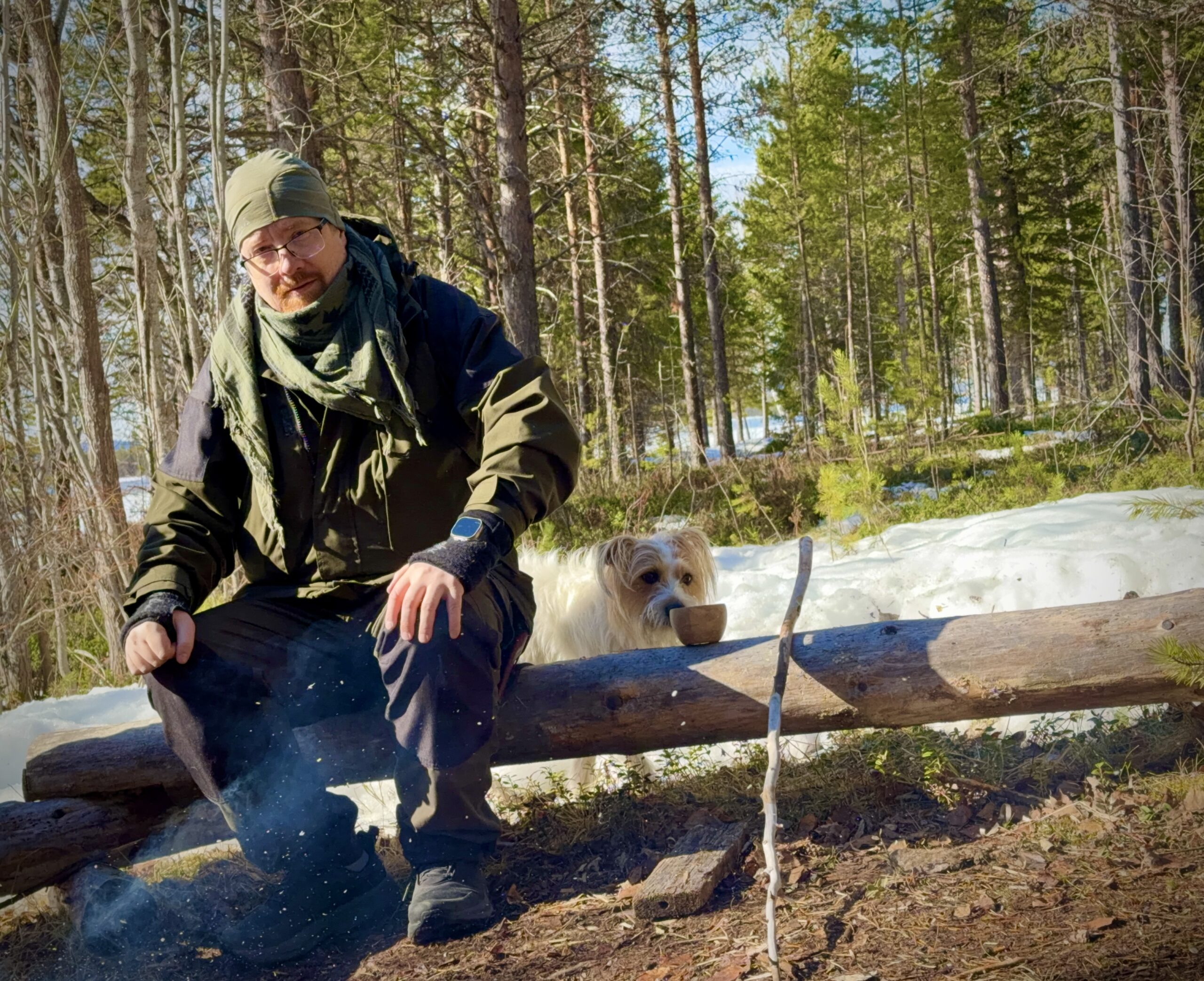 Men vi kan ta en bild från när jag var ute med mina söner i vårt camp i skogen, då solen lyste, det var +4 grader men det blåste väldigt mycket. Låt mig förklara mitt klädval och utrustning på denna bild.