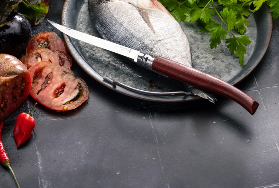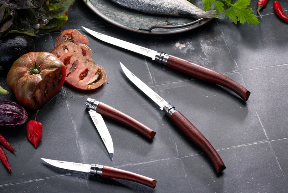 Effilé är förstås avsedd att vara en filékniv eller kock-kniv från Opinel. Vi återfinner det tunna och fina bladet från dom klassiska modellerna, men här är det lite mer “utdraget” och lite mer “slim”. Den största fördelen med Effilé modellerna är att dom är löjligt enkla att skära exakt med. Aningen bättre än den klassiska versionen faktiskt.