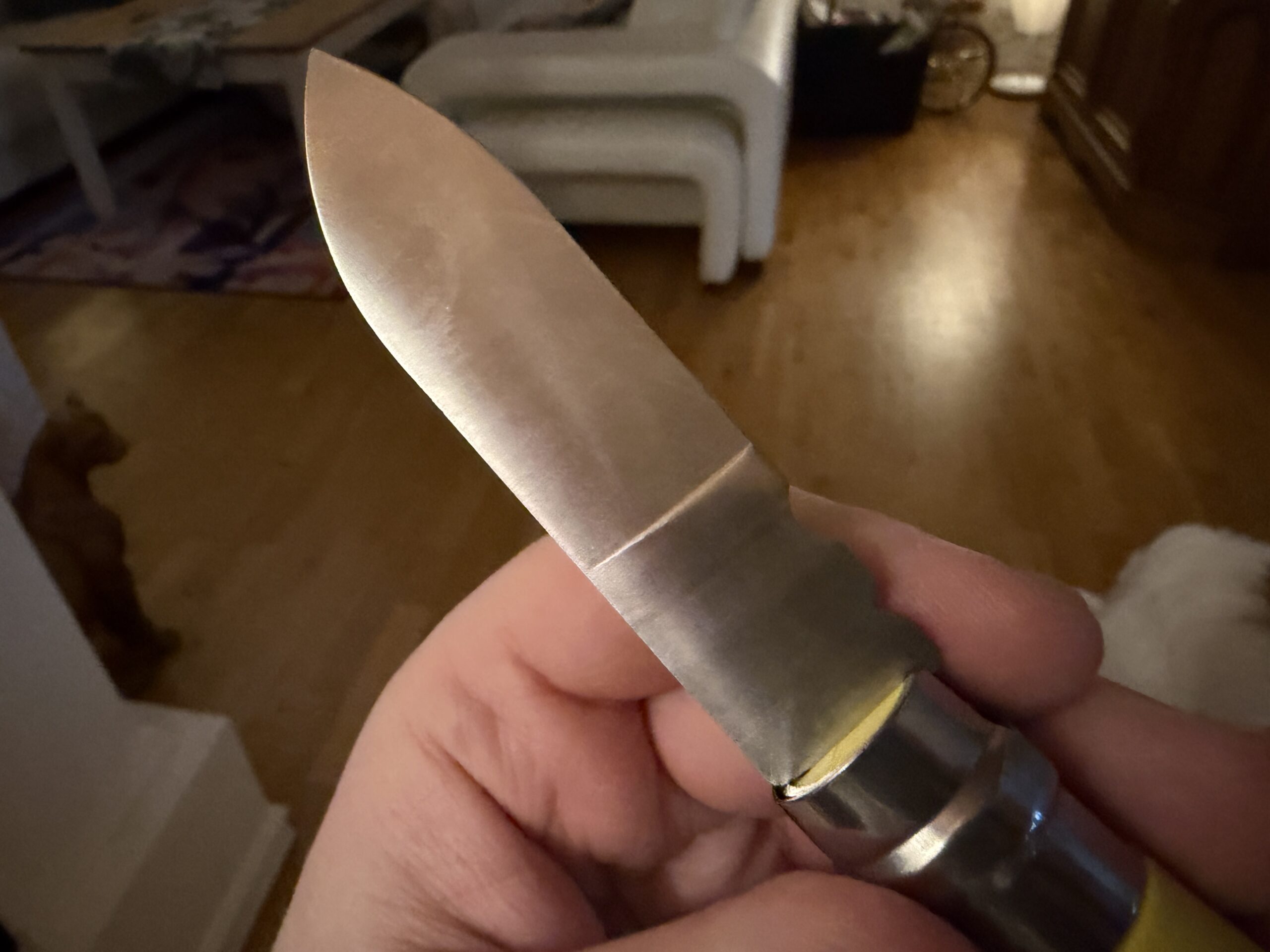 - Sandvik 12C27-stål: Bladet är robust (tjockare än på standard-No.9) och håller skärpan bra samtidigt som det är rosttrögt och lätt att underhålla. Jag gillade inte att bladet inte är vasst hela vägen, utan bara dom 5,5 cm från spetsen och bakåt är egentligen användbart. Om du tittar på bilden nedan så ser du var slipningen slutar, vilket syns som en kant på bladet.