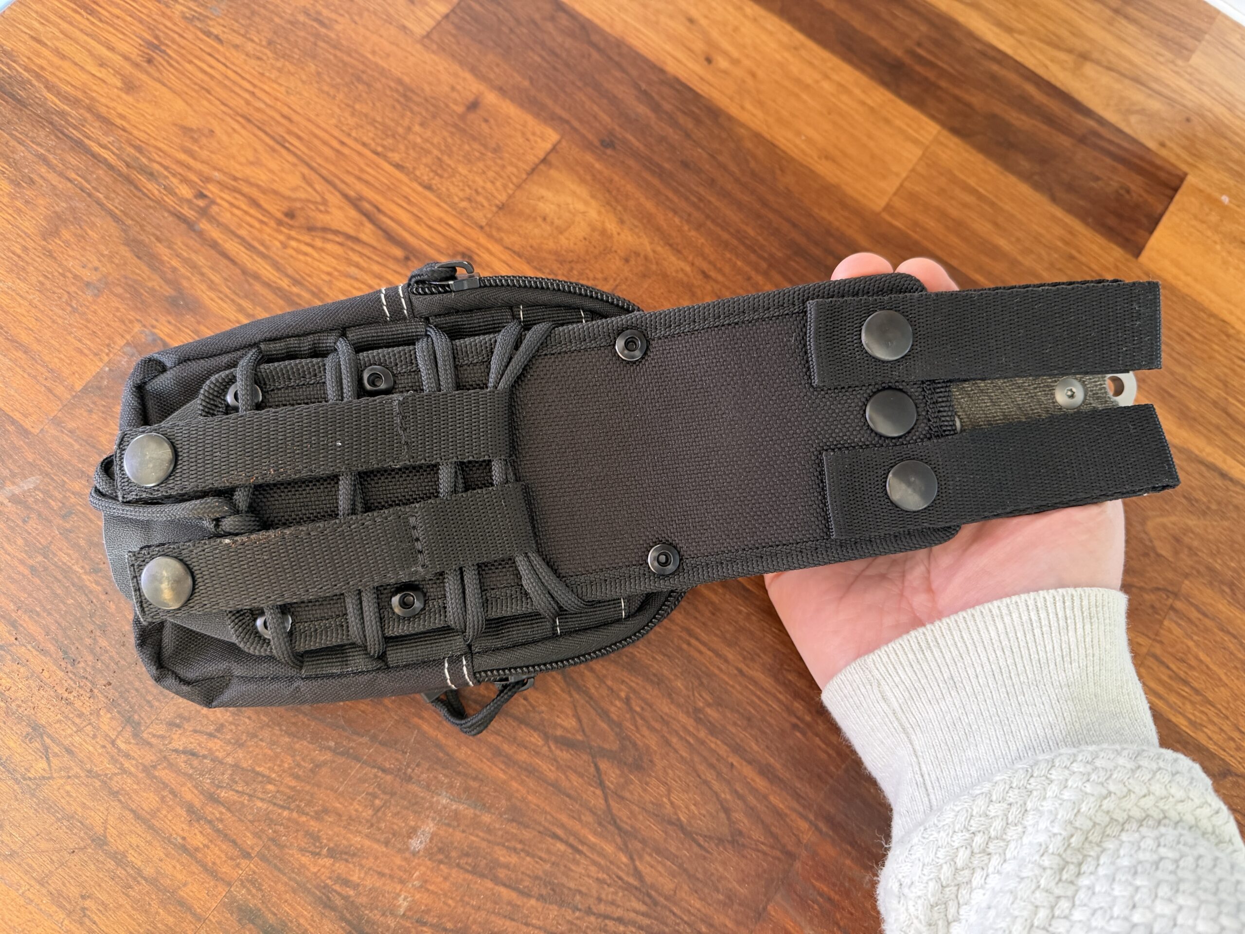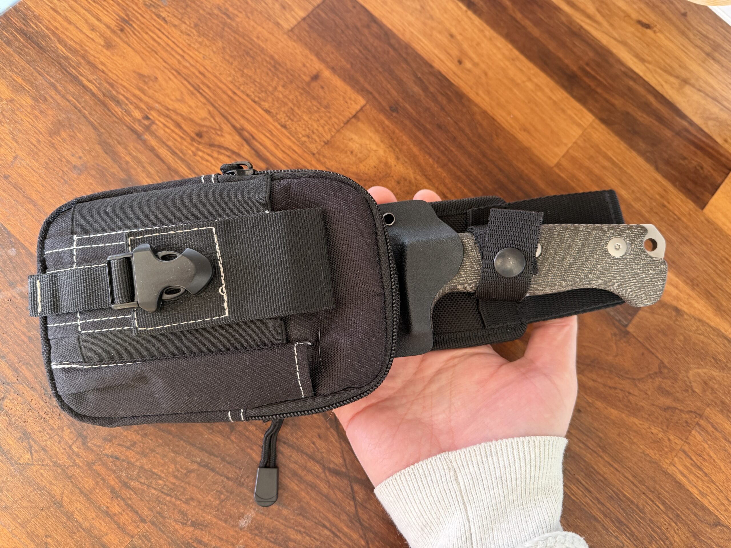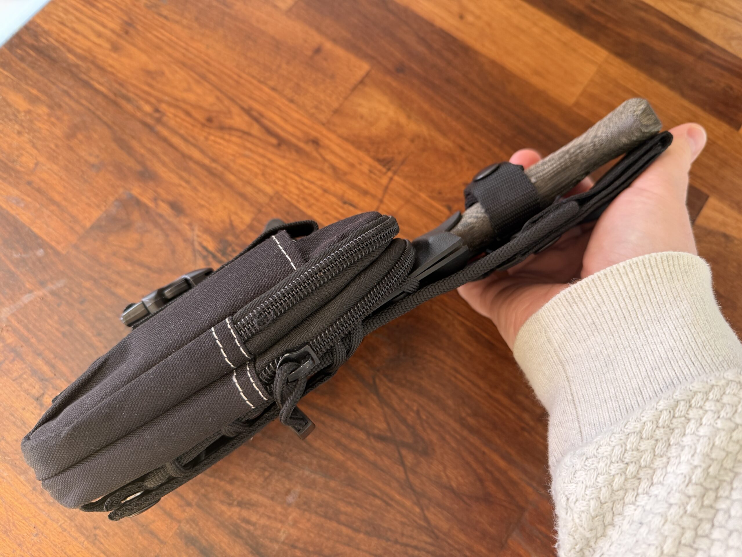 Om du tittar på den så ser det rätt så komiskt ut. En hel väska som är fastsatt på kniven? Men faktum är att denna väska bara väger några gram, samtidigt som den medför att jag kan bära saker som är packade bredvid varandra istället för staplade ovanpå, vilket gör den tunnare än man kan tro.