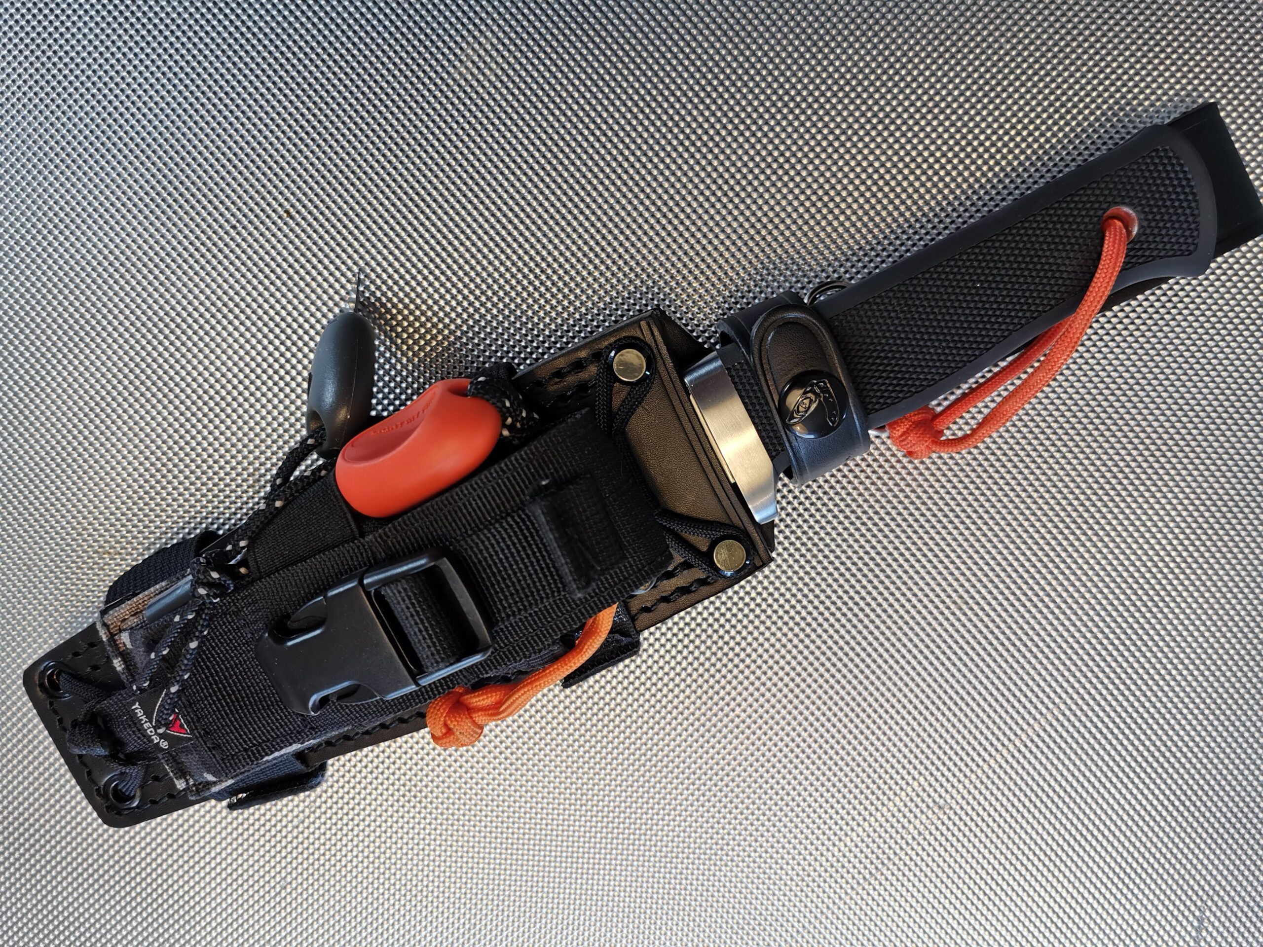 Till en början så kändes det klumpigt och dumt att göra en redan tung kniv ännu tyngre. Men på något sätt så blev detta mitt “kit” som jag använde ute i skogen rätt så ofta. Jag kunde helt enkelt använda en tunnare vindjacka och även om jag gick med t-shirt på mig så hade jag eldstål och annat med mig, på kniven.
