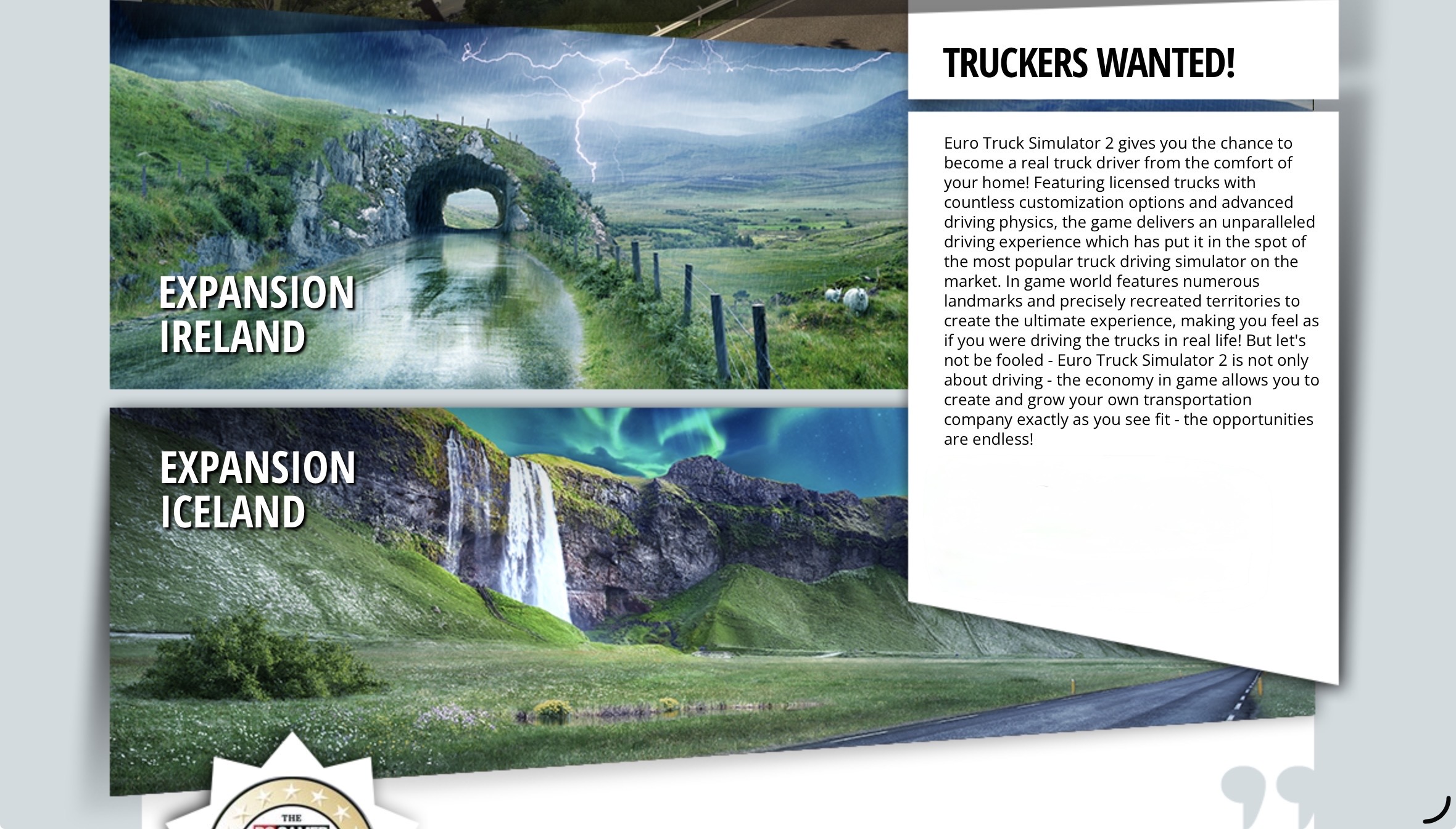 Euro Truck Simulator 2 är egentligen inte ett speciellt avancerat spel. Det är inte otroligt snygg grafik eller erbjuder speciellt revolutionerande känsla. Men den simulerar en lastbil på ett väldigt bra sätt. Man har trafikregler, poliser, fartkameror, trånga vägar, ett nätverk med andra förare och mycket annat realistiskt. Det finns dessutom ett frodigt modding-community, som ger spelet livet åter med jämna mellanrum.