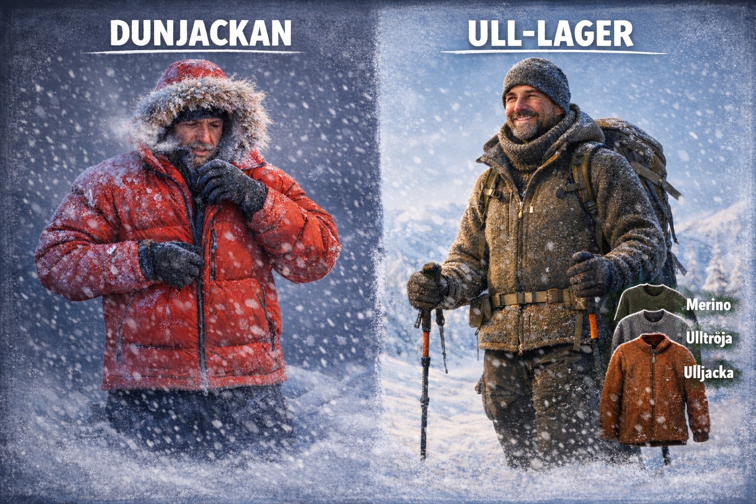 Det finns en närmast religiös tro på tjocka dunjackor när termometern visar -30 grader. I varje outdoorforum, på varje fjälltur, i varje utrustningsbutik så framställs dunjackan som den ultimata lösningen för extrem kyla. Visst, dun isolerar fantastiskt bra. Men efter år av vintervandringar, hundpromenader i bitande kyla och oräkneliga tidiga morgnar när frosten biter i kinderna, har jag kommit till en annan slutsats, Nämligen att ull, gärna i flera lager, är helt överlägset för alla som faktiskt rör sig ute.